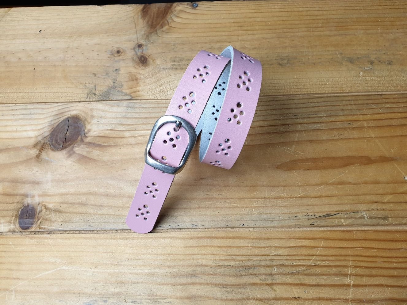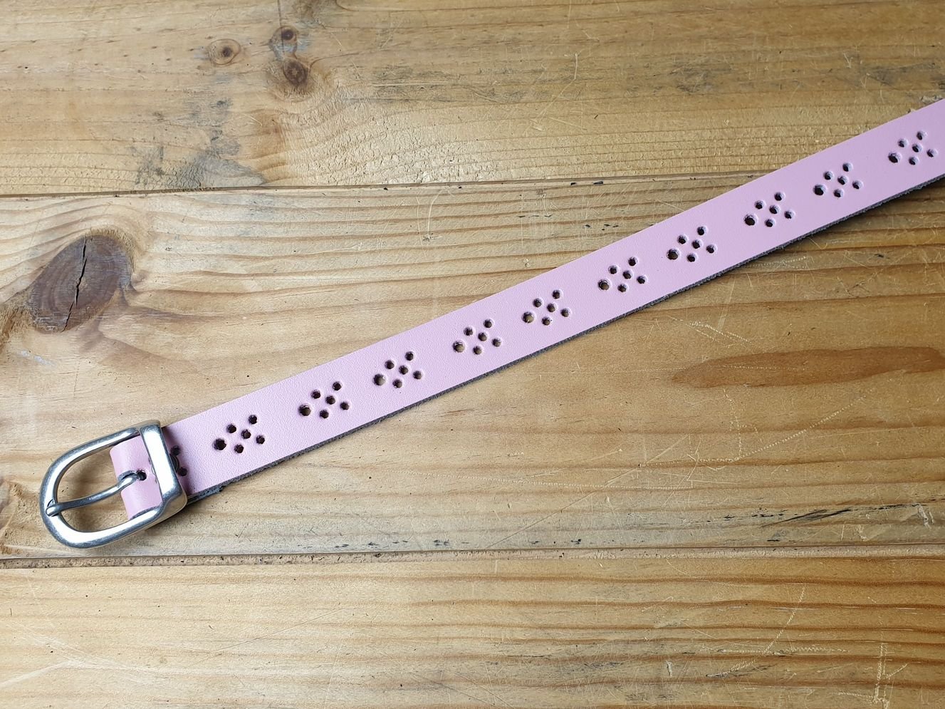 Kindergürtel 2.5 cm breit in rosa Spaltleder mit ganzer Schliesse in altsibrig. durchgehend mit Lochmuster. Kann in jedem Loch getragen werden. Offenkantig, ohne Kantenbearbeitung.