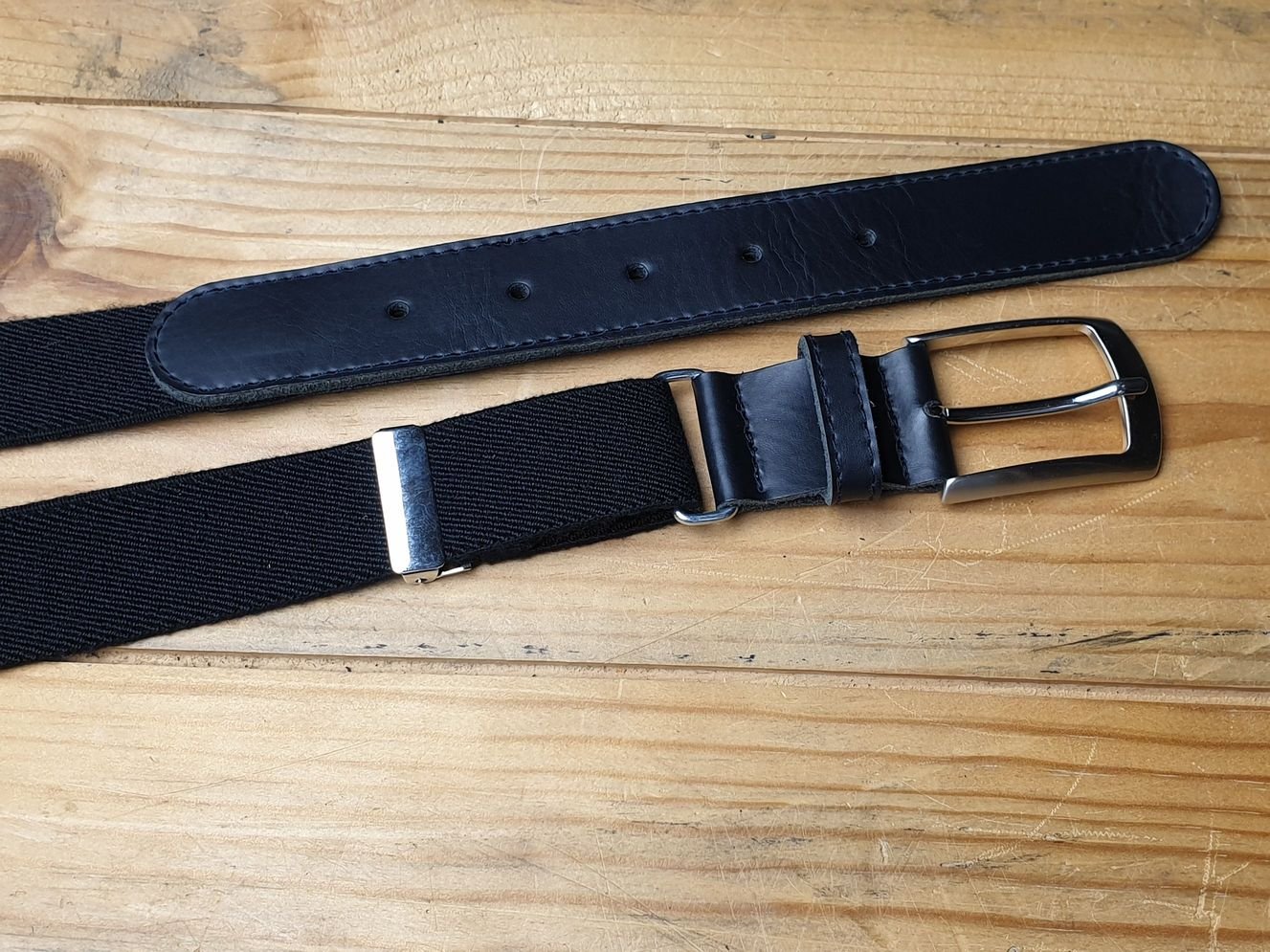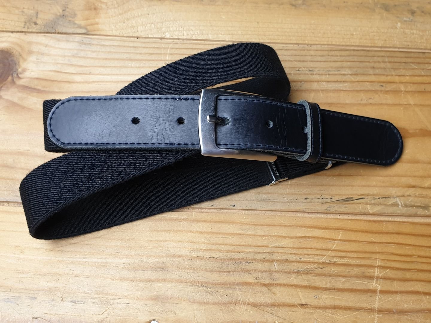 Unser elastischer Gürtel mit Lederpatte in schwarz. Sieht von vorne aus wie ein Ledergürtel, ist jedoch dank Elastband stufenlos verstellbar, 3 cm breit. one size.