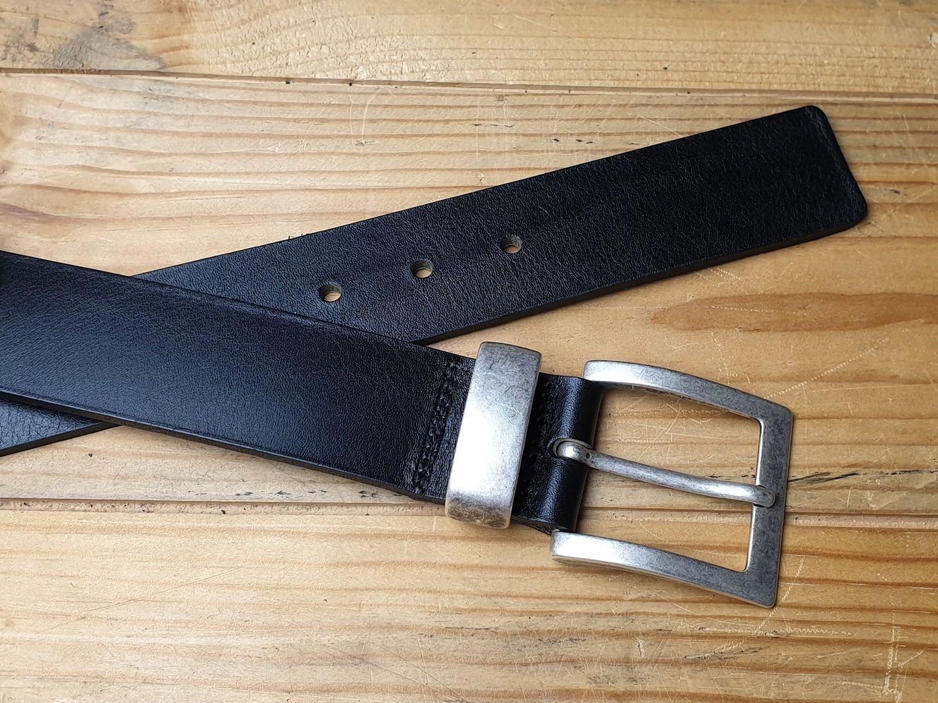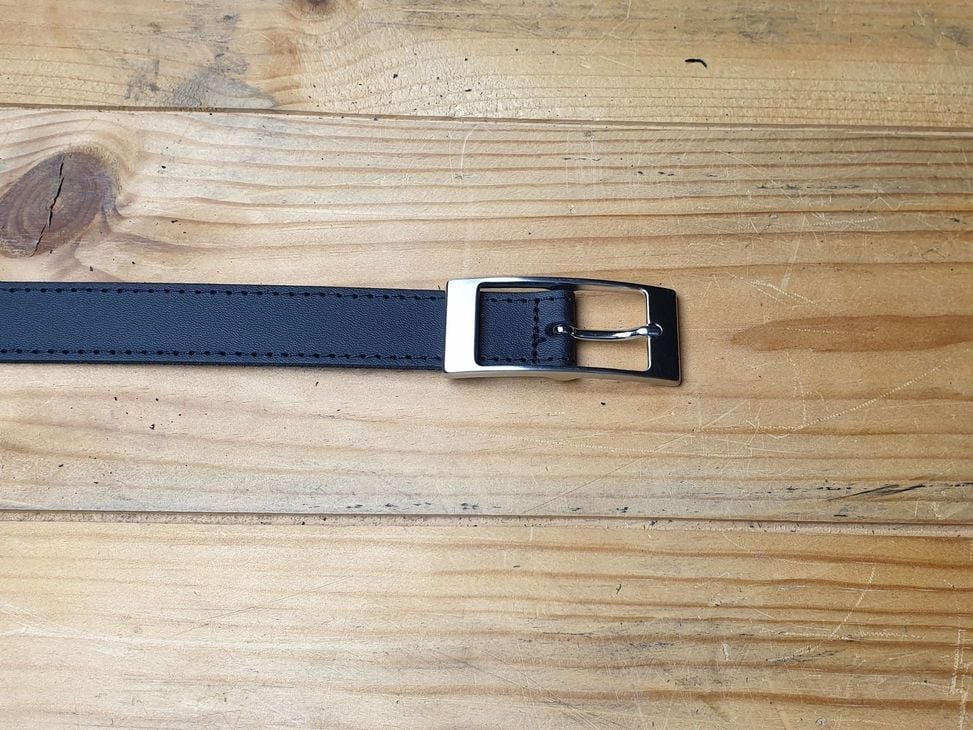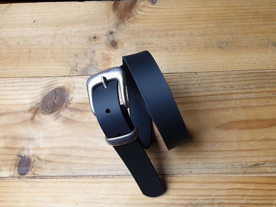Schwarzer Ledergürtel 3.5 cm breit in Spaltleder mit ganzer Schliesse silbrig satiniert.
