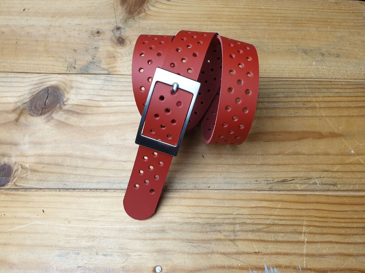 Roter Ledergürtel 3 cm breit in Spaltleder mit ganzer Schliesse silbrig satiniert.