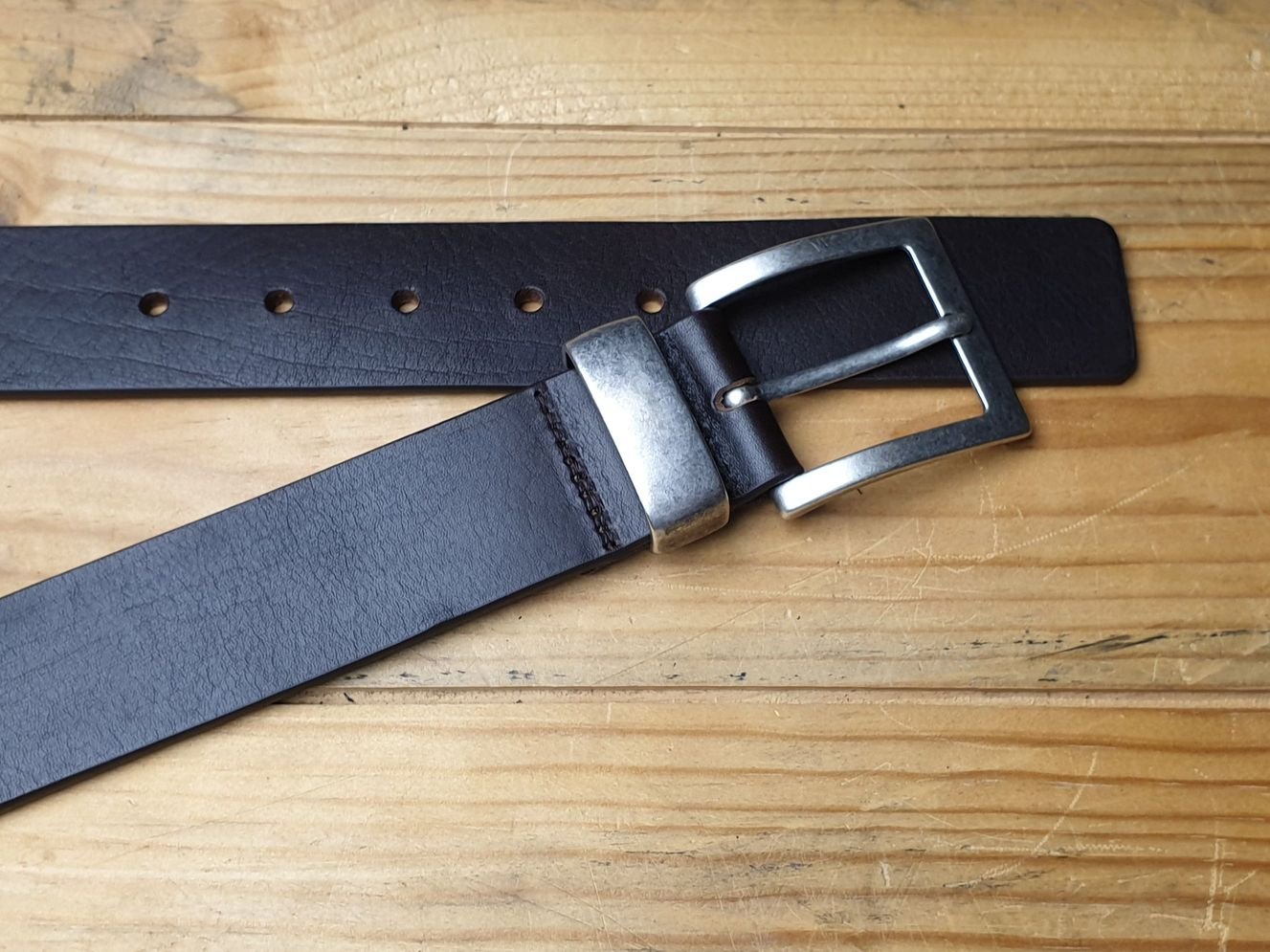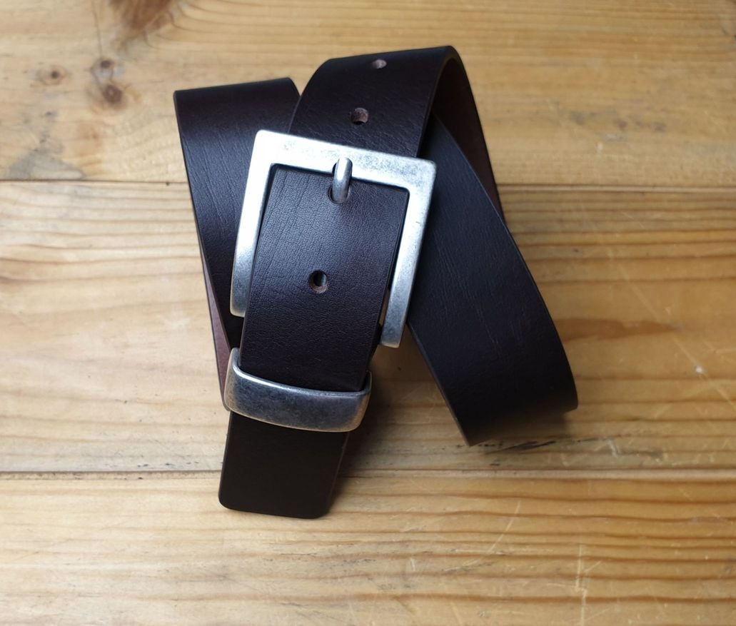 Ein Hingucker in massiver Ausführung. 4 cm Vollrindledergürtel in dunkelbraun. Jeansschliesse und -Schlaufe in altsilber Optik. Kante gerundet, gemalt und poliert.