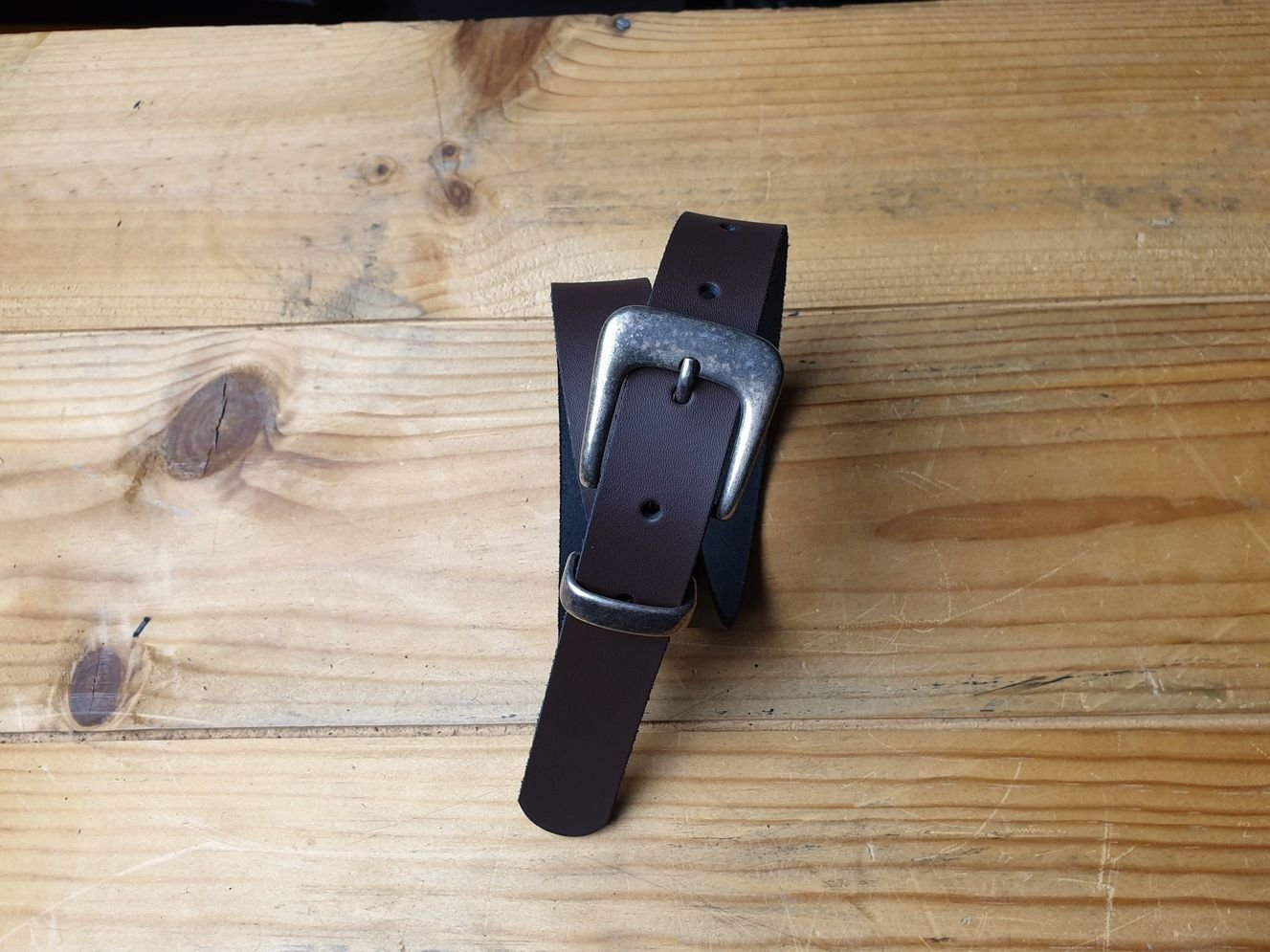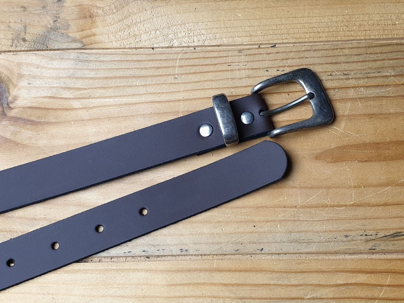 Brauner Kindergürtel 2.5 cm breit in Spaltleder mit Metallschlaufe, altsilber. Offenkantig, ohne Kantenbearbeitung.