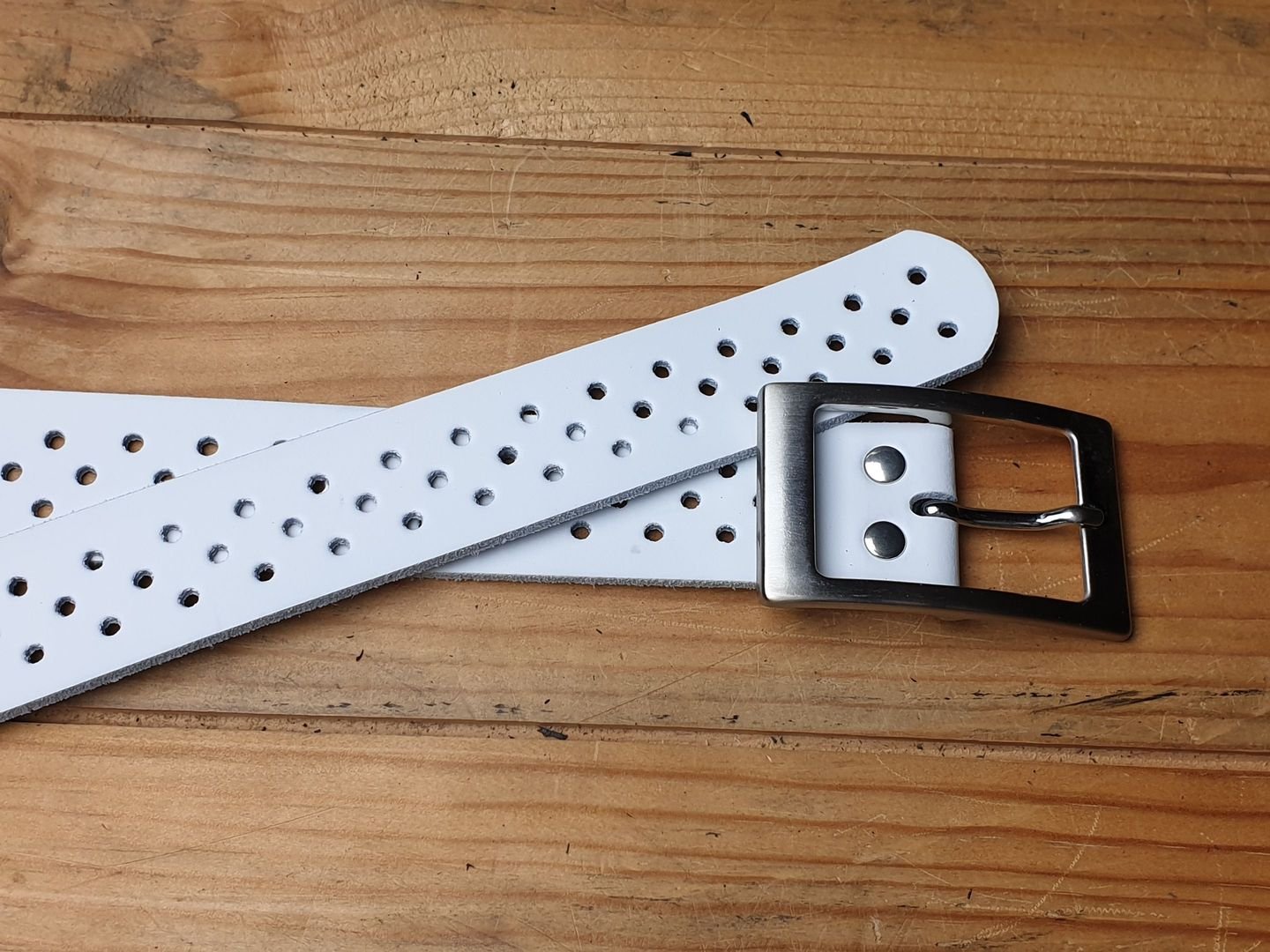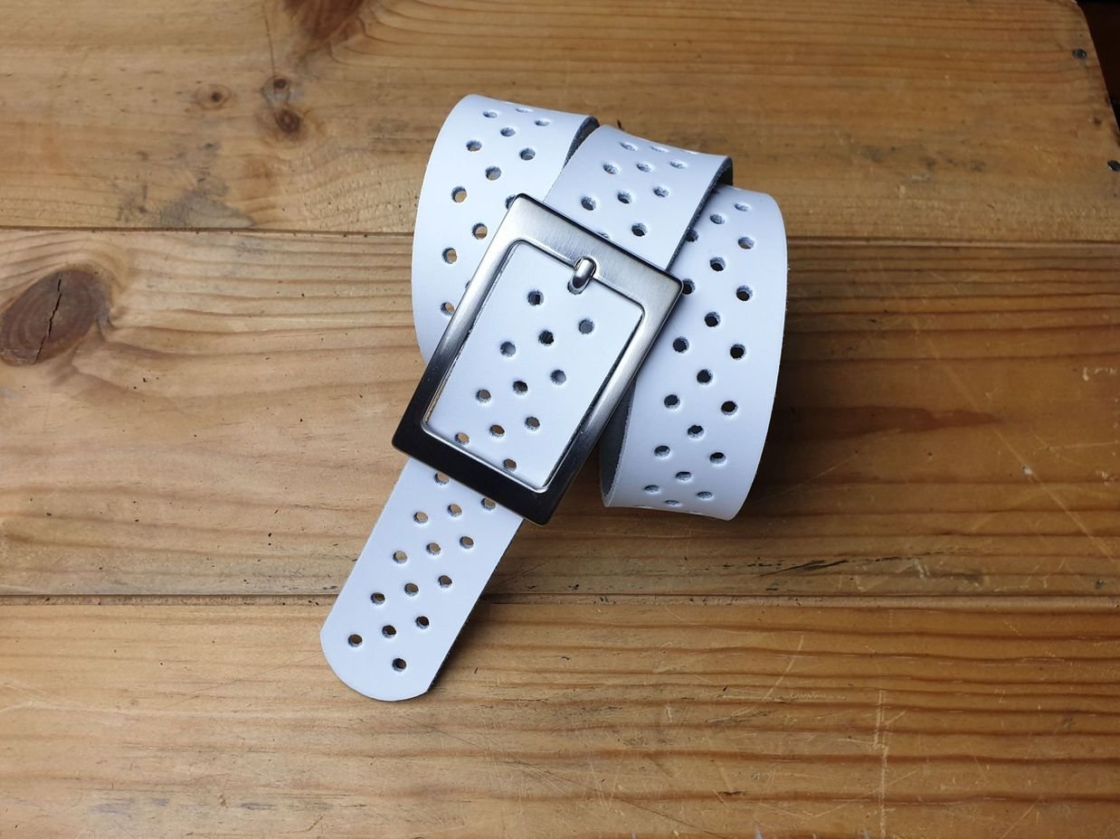Weisser Ledergürtel 3.5 cm breit in Spaltleder mit ganzer Schliesse silbrig satiniert.