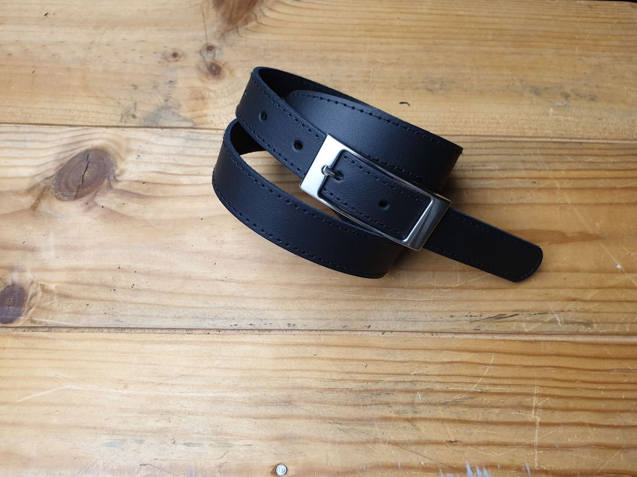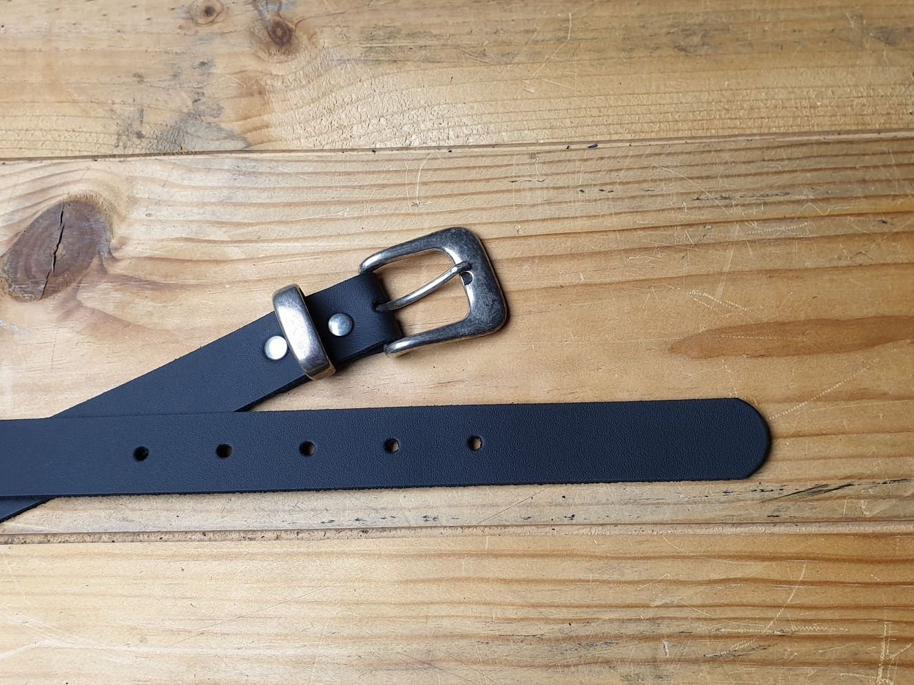 Schwarzer Kindergürtel 2.5 cm breit in Spaltleder mit Metallschlaufe, altsilber. Offenkantig, ohne Kantenbearbeitung.