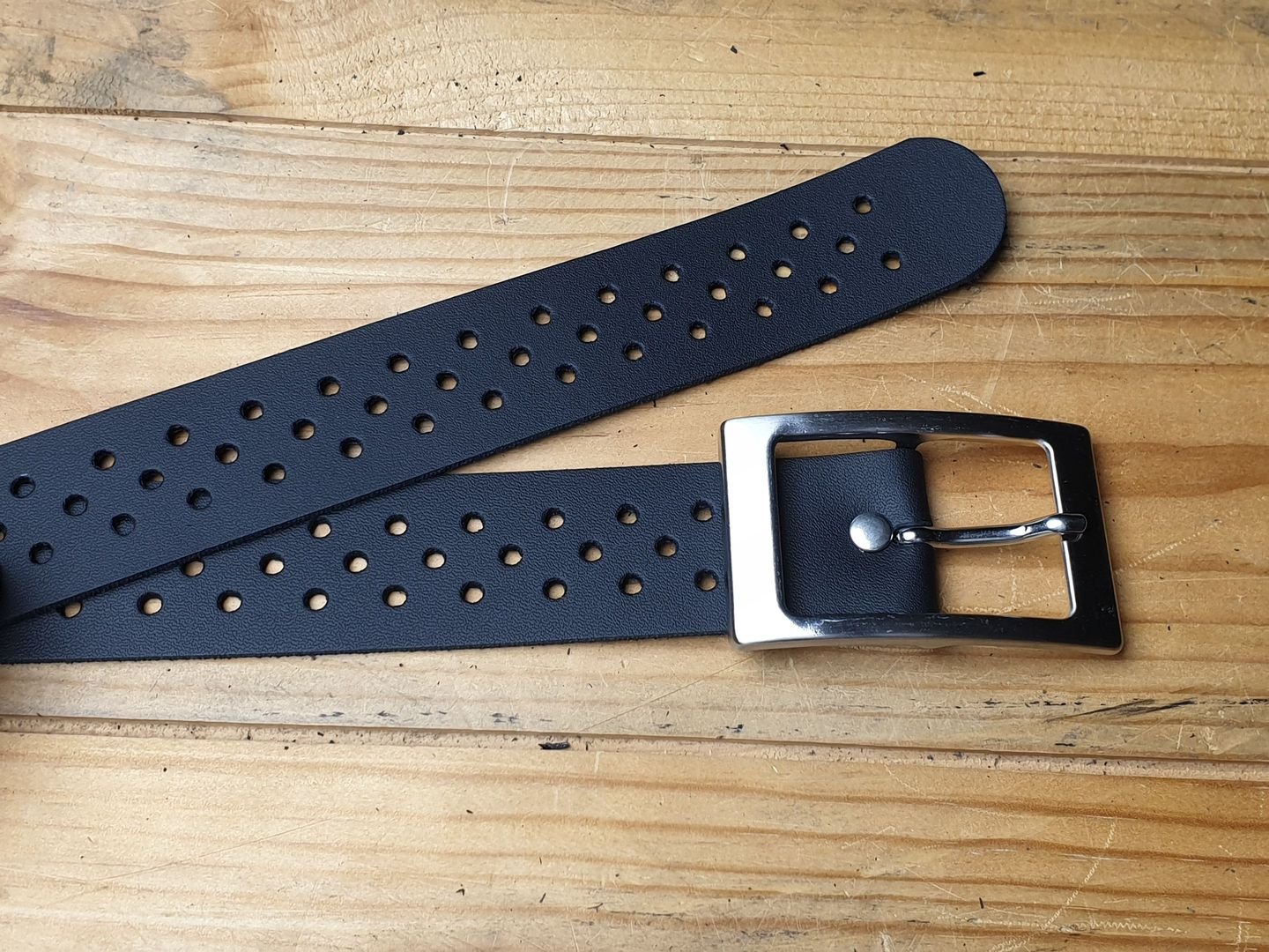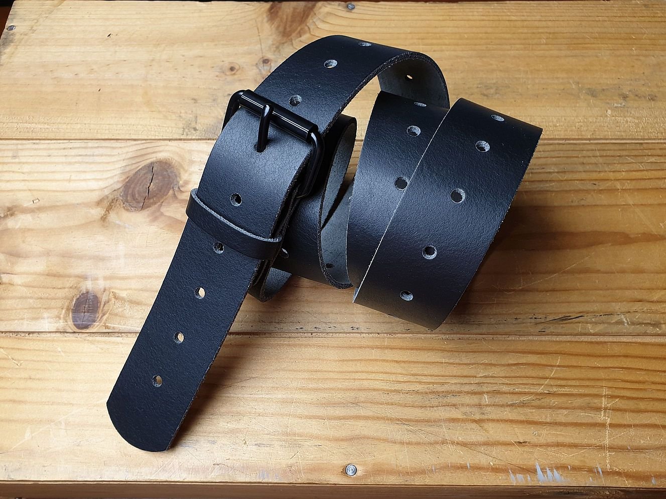 Ein Arbeitstier. Unser Arbeitsgürtel in schwarz. 4 cm breit. durchgängig gelocht. Rollschliesse geschwärzt. Weiches Rindleder. Lederlänge 140 cm. Von Hand vernietete Doppelhohlnieten. Offenkantig. one size