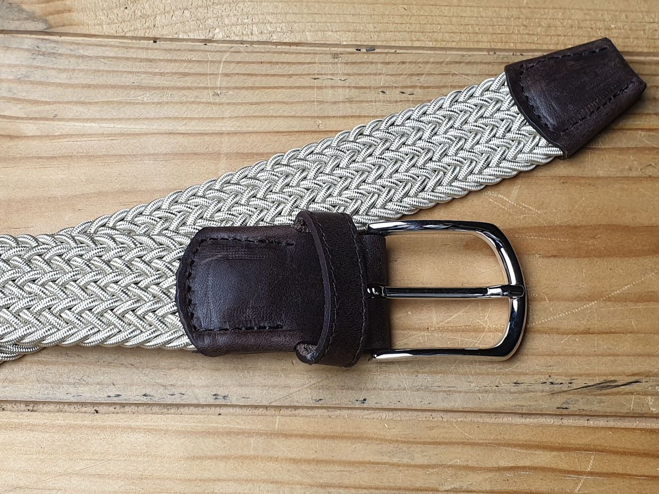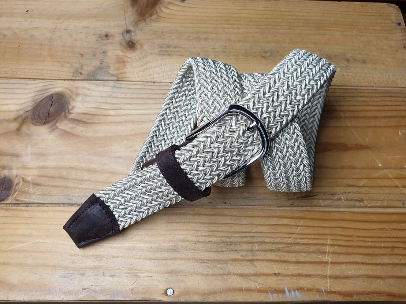 Edel und bequem. Elastischer Gürtel in beige mit brauner Lederpatte und Lederspitz. Feste Webung. Breite 3.5 cm, Messingschliesse in silbrig glänzendem Finish.
