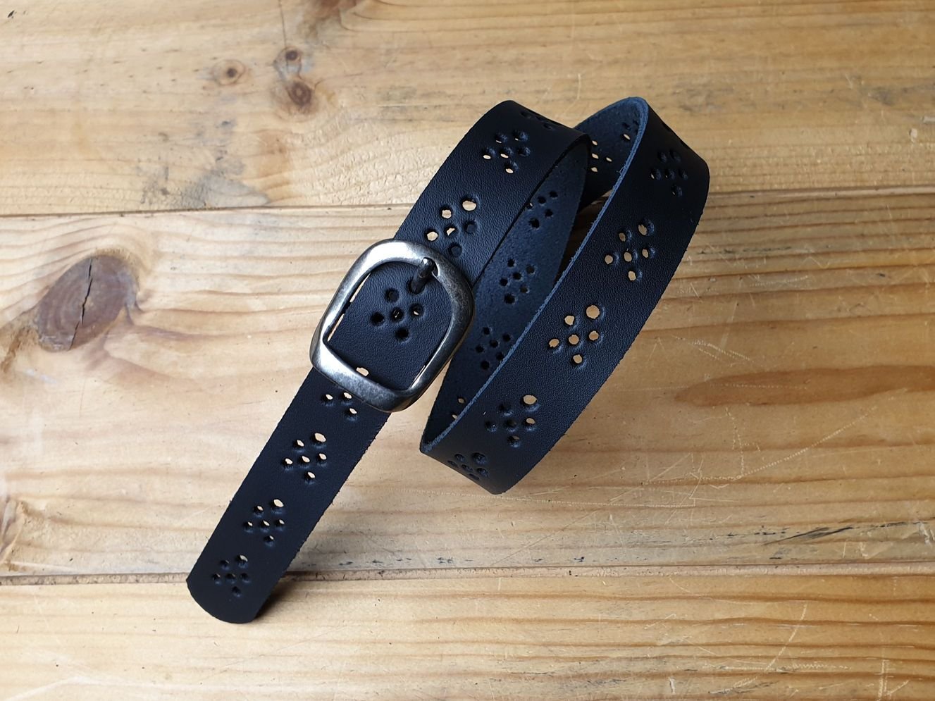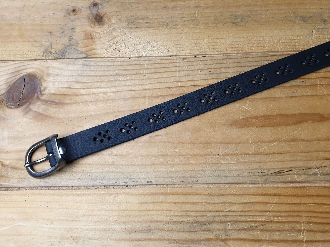 Kindergürtel 2.5 cm breit in schwarzem Spaltleder mit ganzer Schliesse in altsibrig. durchgehend mit Lochmuster. Kann in jedem Loch getragen werden. Offenkantig, ohne Kantenbearbeitung.