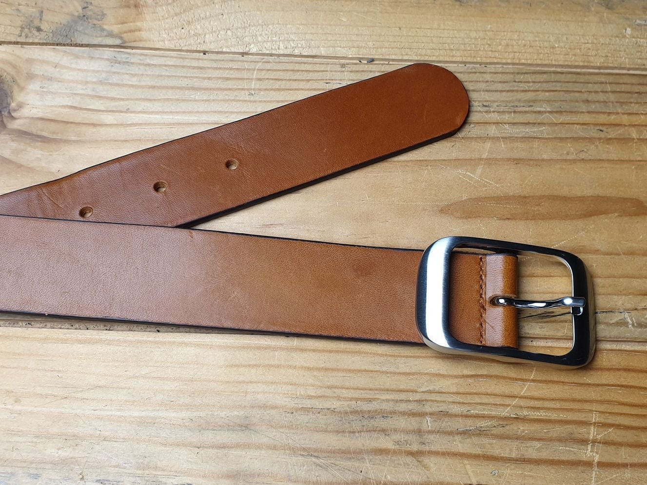 Offenkantig, ohne Kantenbearbeitung. Gürtel abgenäht im Ton des Leders.