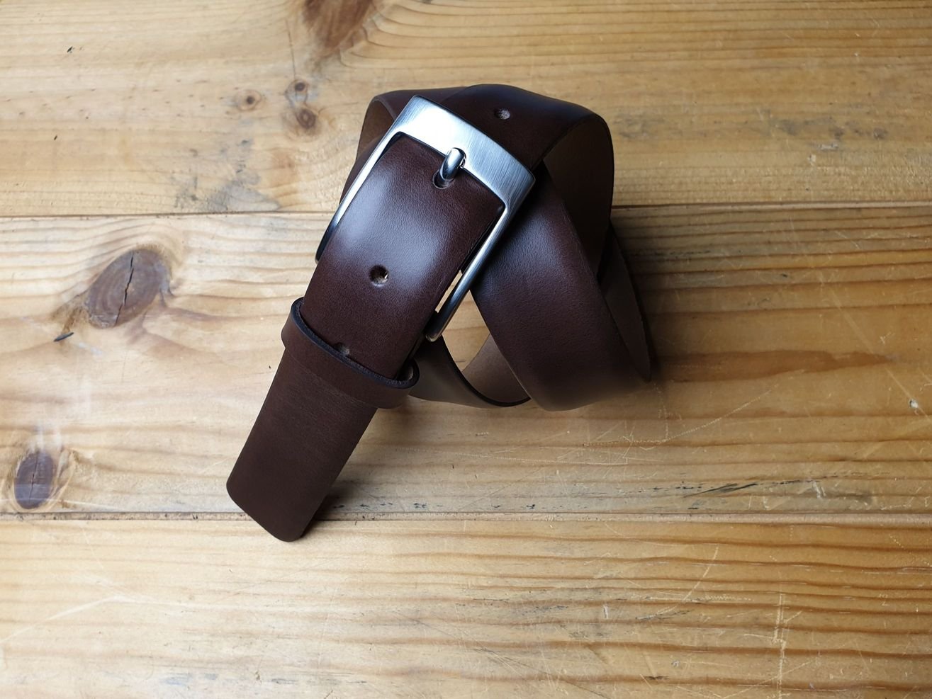 Der Businessgürtel in dunkelbraun. Ein Klassiker. 3.5 cm breiter Rindledergürtel, bombiert, Kanten gemalt. Klassische Schliesse in mattsilber poliert.